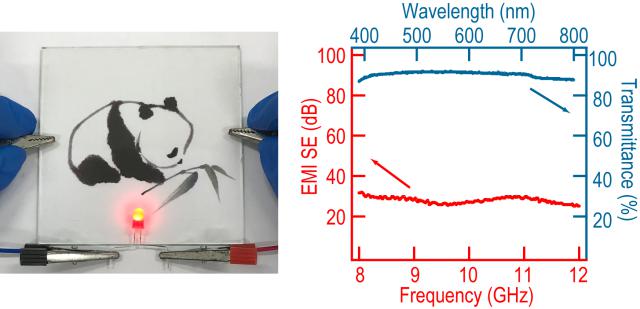 基于银纳米线(Ag NWs)良好的导电性及大的长径比,研究团队通过简单方法将银纳米线呈均匀网状平铺于基底,制备出了透明的电磁屏蔽薄膜。通过清洗及PDDA处理进一步提升了薄膜的导电性、透过率和表面平整度。最终得到的Ag NW/PDDA复合薄膜的透过率达95.5%时,方阻为22 Ω sq−1,品质因数达到433,比目前应用广泛的ITO具有更优异的性能。在PDDA层的保护下,其性能在65%相对温湿度的环境下放置35天后仍无明显变化。值得注意的是,当Ag NW/PDDA复合薄膜的透过率为91.3%时,其平均屏蔽效能为28 dB,并且随银线浓度的升高,其屏蔽效能可达到31.3 dB而其透过率仍维持在86.8%,其电磁屏蔽效能优于目前报道过的多种透明电磁屏蔽材料。