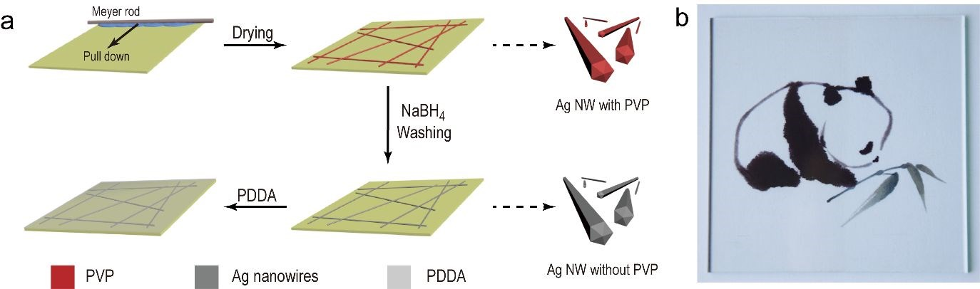 近日,52书库 应用物理系在该研究方向取得新进展。在实验上展示出大尺寸透明银纳米线导电薄膜,其可见光透过率超过90%,屏蔽效能可达到31.3 dB,为推进实用化奠定了基础。