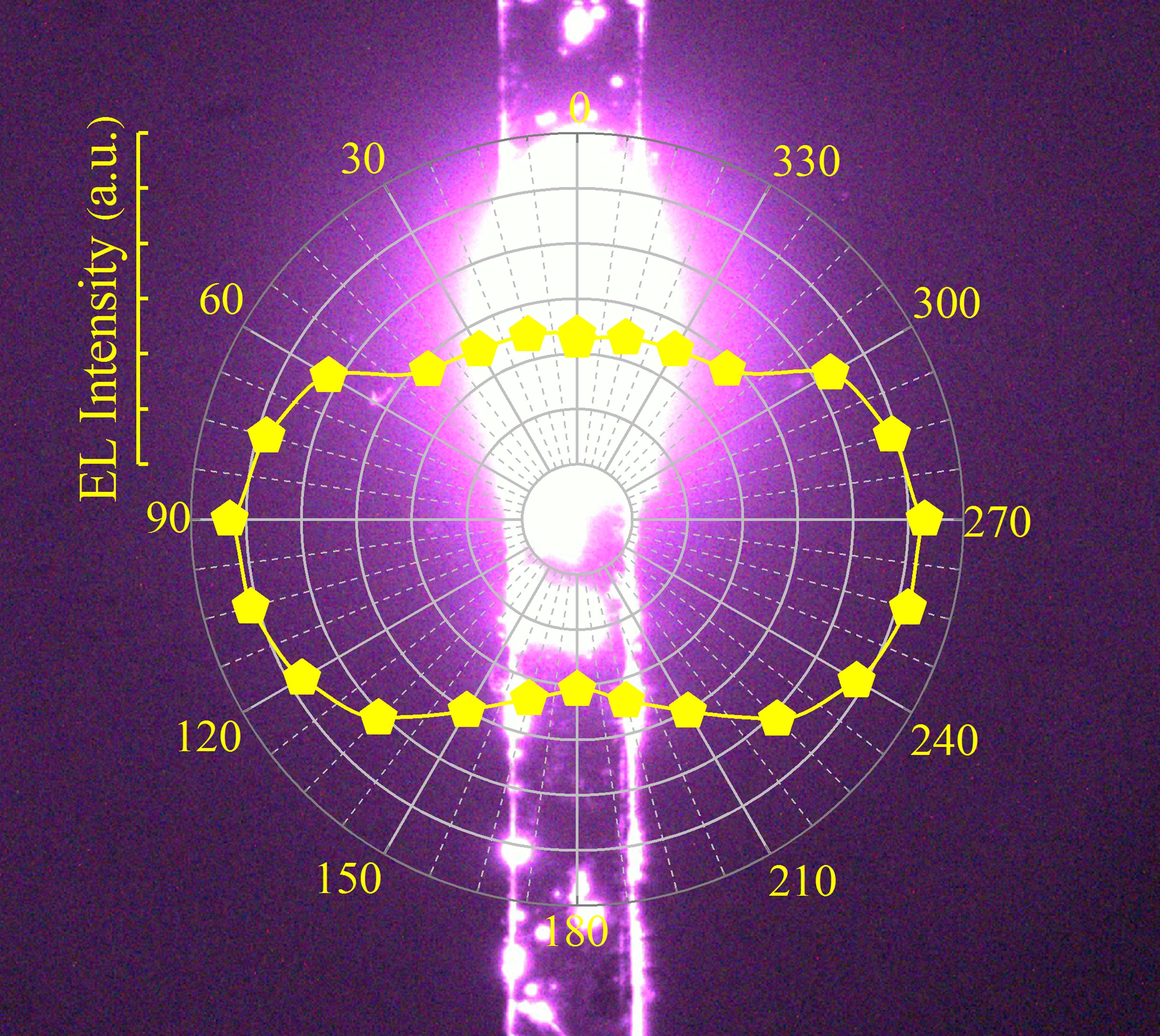 本研究工作依托阚彩侠教授课题组(光电功能材料、器件与物理课题组)平台,在实验上采用化学气相输运沉积实验方法合成了ZnO:Ga微米带,结合p型GaAs衬底构建了n-ZnO:Ga微米带/p-GaAs异质结。该异质结发光二极管器件可以在近红外波长880nm处发射,光谱半高宽约为55nm。从其电致发光光谱可以看出:光谱由一系列窄的发光峰叠加组成,且可以获得长波范围模式间距展宽现象,表明了微米带近红外LED中可以发生较强的光-物质相互作用,实现了电驱动操作下的激子-极化耦合。实验上制备的单根ZnO:Ga微米带拥有较高的结晶质量,其横截面构筑的Fabry-Perot光学谐振腔能够对发光器件释放的光子形成一定的选择机制,进一步为器件中激子和光子的耦合相互作用提供了谐振腔。通过角分辨电致发光测量的反交叉行为证明了这种的激子-极化强耦合,并估算了相应的拉比分裂能,即激子-光子耦合强度约为109 meV。实验结果为在室温下实现电驱动激子-极化发光二极管提供了可能,也为实现具有低成本、超低阈值的相干光源的制备迈出了有希望的一步。