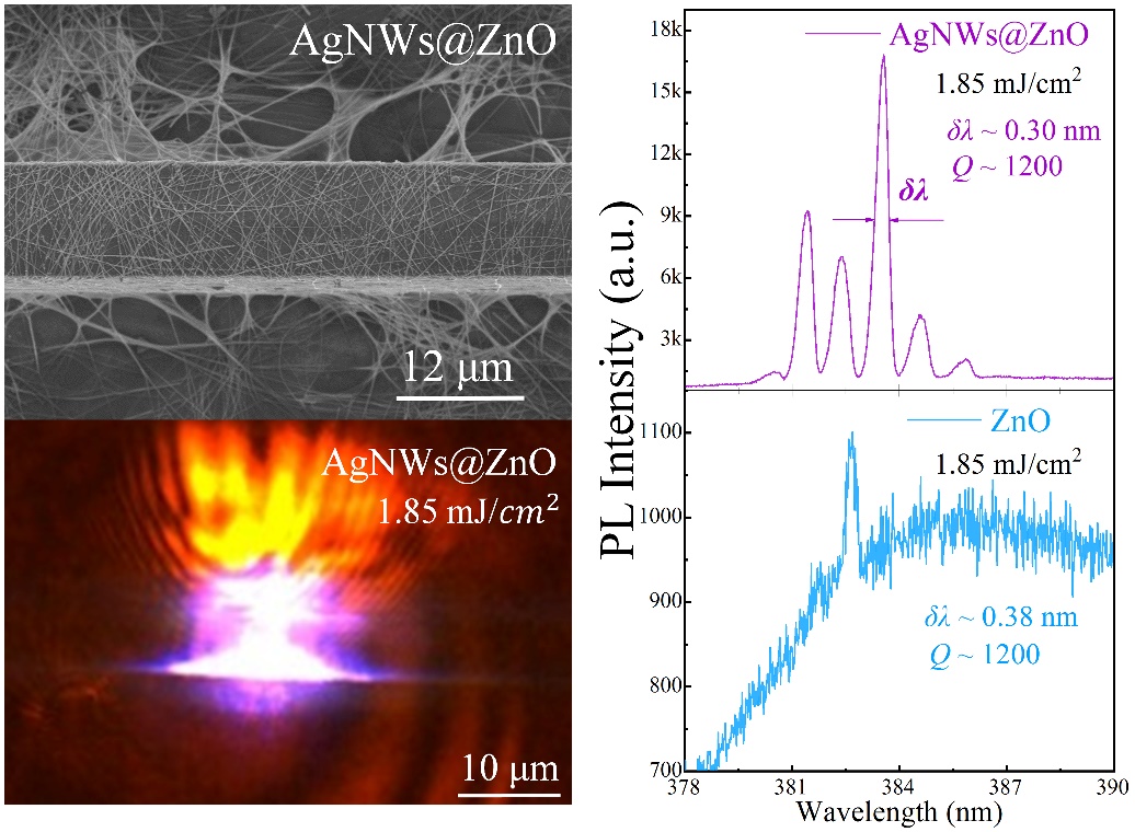 本研究工作依托于阚彩侠教授课题组(光电功能材料、器件与物理课题组)的实验平台,通过化学气相输运沉积法制备合成了横截面为四边形ZnO微米线,用以构筑FP模式激光器。通过聚乙烯吡咯烷酮(PVP)定向多元醇法制备了AgNWs,并将其均匀旋涂至微米线表面以探究AgNWs对ZnO微米线激光器性能的影响。实验结果表明,通过AgNWs的修饰可以显著增强激光的输出、提高激光器的品质因子,并降低激光器的振荡阈值。进一步研究表明,上述激光器的性能改善归功于AgNWs的表面等离激元与ZnO激子的强共振耦合作用,通过二者间的耦合对AgNWs/ZnO MW表面的光场进行限域,补偿介质表面的光损耗并激励更多的光子进入腔内振荡从而显著提升激光器的输出光强。