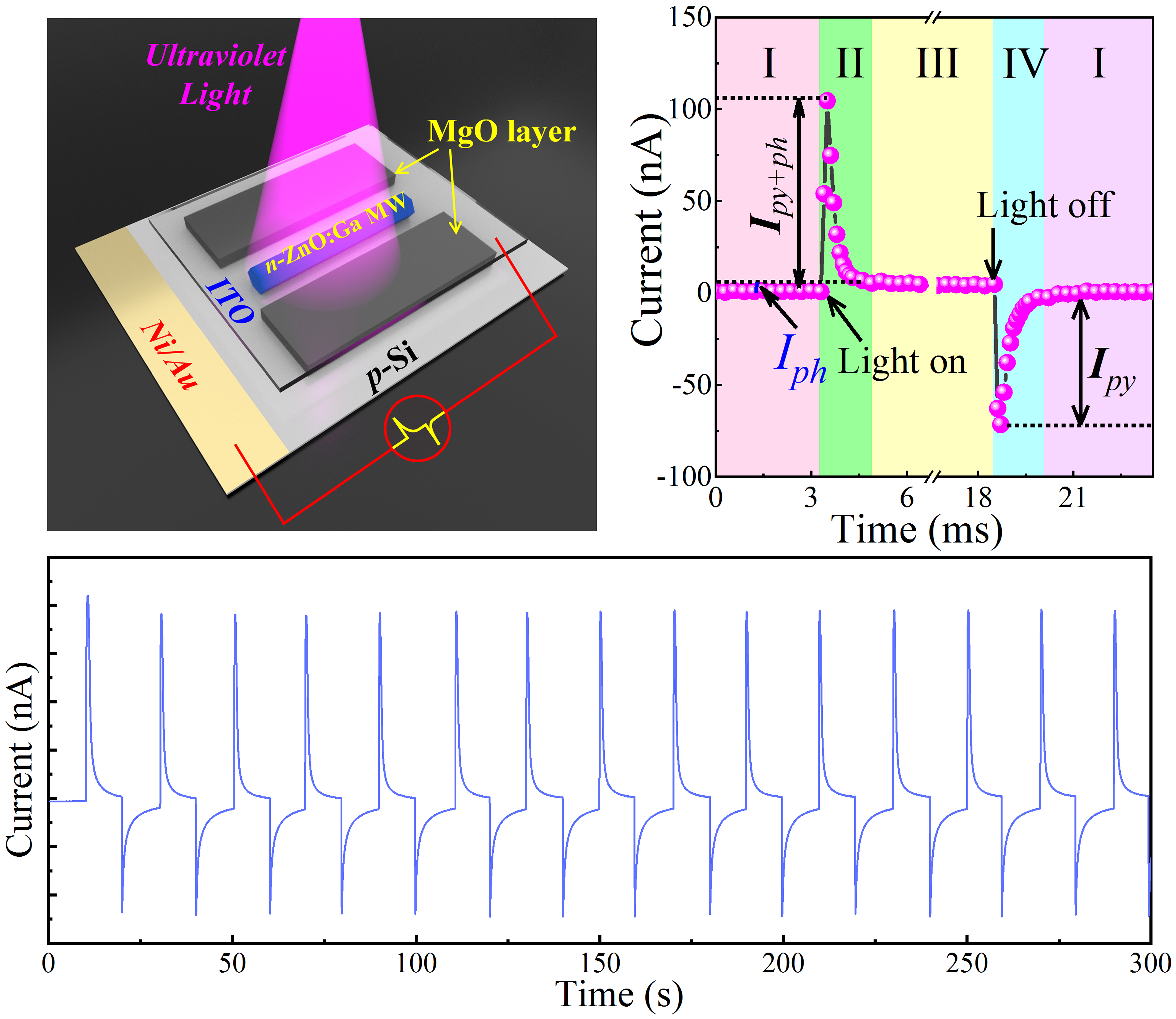 近期,阚彩侠教授课题组采用化学气相沉积的方法制备了高结晶质量ZnO微米线,通过Ga掺杂的方式有效的调控单根微米线的光学以及电学特性。结合商用Si衬底,构筑了自驱动紫外光电探测器件。该器件在紫外波段都呈现出明显的光响应,响应峰值位于370 nm 处。器件的明暗电流比为103, 相应的光响应峰值为0.185 A/W,探测率为1.751012Jones, 较快的相应速度(499/412 μs)。由于非中心对称的晶体结构和沿c轴上自发极化,纤锌矿结构ZnO 微米线是一种常见的热释电材料,当光照射到ZnO 微米线的表面时,光热效应会在材料中产生温度瞬间变化,从而在ZnO微米线 表面产生热释电极化电荷。基于热释电效应(Pyro-Phototronic effect),极大的提高了所制备的n-ZnO:Ga/p-Si异质结自驱动紫外光电探测器器件的性能指标参数。器件的响应率从0.185 A/W提升至0.25 A/W,比探测率增强至 ~ 1.75×1012 Jones,响应时间缩短到 ~ 79/132 μs。该器件为低维、高效、智能Si基光电探测器的制备提供了一种可行方案,在通讯、导弹预警与跟踪、生物医学、火灾预警等多个领域有着广阔的应用前景。
