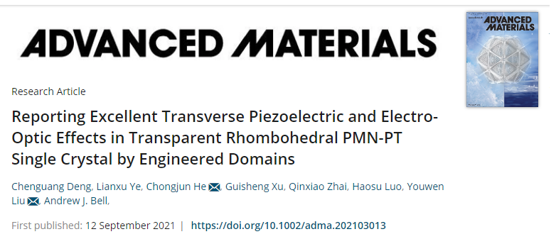 近日,国际顶级期刊《Advanced Materials》(先进材料,IF:30.849)在线发表52书库 理学院团队的研究成果“通过铁电畴工程实现具有优异横向压电和电光效应的透明PMN-PT单晶”,该论文第一作者为理学院博士生邓晨光,理学院刘友文教授和航天学院赫崇君副教授为论文通讯作者。