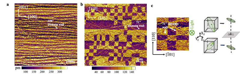 图2(a)PMN-PT单晶的压电力,层状分布的109°畴(b)PMN-PT单晶压电力图像,层装分布的71°畴(c)71°层状畴的折射率椭球模型,相同的折射率椭球投影保证了样品侧面方向的透过率。