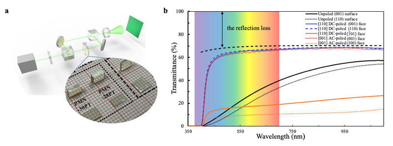 图1(a)用于横向调制的PMNPT透明铁电单晶(b)109°单畴和71°单畴的PMNPT晶体样品,沿不同轴向的透过率