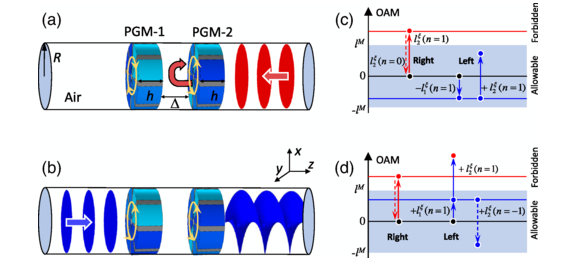非对称传输现象因其在实现单向器件上起着重要作用而受到研究人员广泛的关注。近年来,为实现光/声的非对称效应,研究人员探索了诸多方案,例如磁光材料、非线性、非厄米调制、拓扑绝缘体以及超构表面等,并揭示了诸如单向模式转化、非对称衍射和单向等离激元激发等众多新奇现象。然而,这些方法主要局限于低自由度的平面波场,很难拓展到更高维度的结构波场,例如,具有轨道角动量(OAM)的涡旋场。