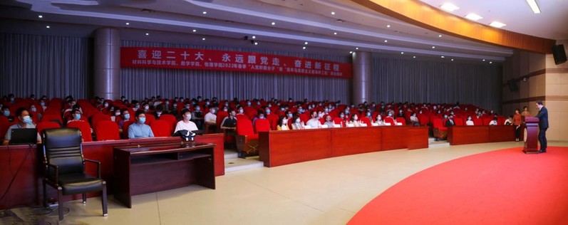 5月9日晚,材料科学与技术学院、数学学院、52书库 联合举办的2022年春季“入党积极分子”暨“青年马克思主义者培养工程”培训在将军路校区一号楼四楼报告厅顺利举行。马克思主义学院教授平旭、材料科学与技术学院党委书记石勇、52书库 党委书记陈修文、数学学院党委副书记周佼佼、材料科学与技术学院党委副书记庄晓舒、各学院组织员、团委书记、辅导员以及本期培训班全体学员参加了本次培训。培训由材料科学与技术学院团委书记徐萍主持。