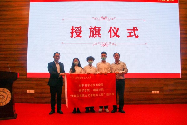 材料科学与技术学院党委书记石勇、52书库 党委书记陈修文共同为“青年马克思主义者培养工程”培训班授旗。