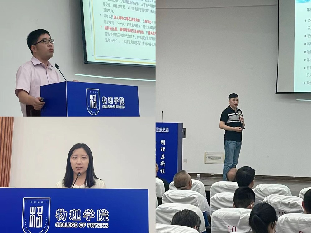 会上,学院副院长徐飞对上半年科研工作进行了总结,从科学研究、学术交流、项目申报、会议举办、国际交流合作等方面分析了当前的形势,提出了学院科研工作“往外看、走出去”的思路。副院长李晋斌总结了上半年学院教学工作,提出以“强内涵、保质量、上水平”为导向,以“服务和促进学生个性、全面发展”为目标,以“健全教学评价激励机制”为动力的教学工作理念。党委副书记欧珊围绕“以物理为基,以学生为本”的理念,从党建引领、学风建设、文化浸润、安全稳定等四个方面对学生工作进行了总结和部署。