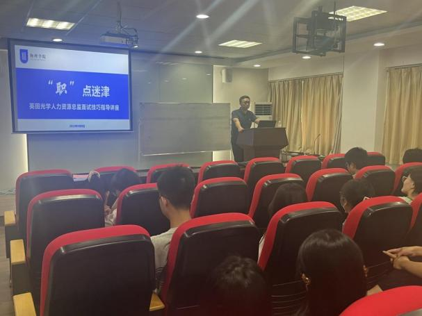 英田光学人力资源总监刘秋庭做“职”点迷津面试技巧培训讲座,他用专业的思路帮助同学们解读求职过程中的注意事项,详细讲解常见的面试问题所考察的维度,包括自我认知、独立性、抗压性等,帮助学生掌握STAR法则,引导学生系统梳理自身实践经历,认清自身优势,提升求职自信。