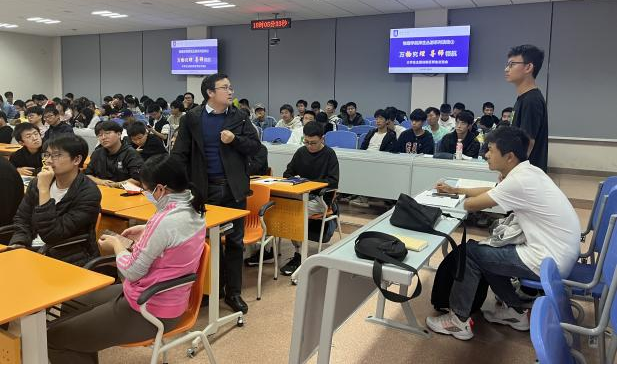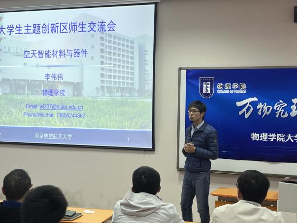 卢俊峰介绍了52书库 大学生主题创新区的建设情况、创新区对本科生创新实践能力培养的支撑,鼓励学生积极了解、投身科研科创,提升素质能力。九大主题创新区包括“物理科学与应用”、“紫外日盲探测”、“空天智能材料与器件”、“物理实验演示与探究”等。每个创新区老师代表分别介绍了创新区的基本情况、主要研究方向以及所在领域的前沿发展、实验室设备条件、人才培养模式以及可供本科生选择的科创项目。李伟伟老师介绍了跟航空学院合作研究的空天智能材料与器件课题;姜明明老师介绍了紫外探测器在军事与日常生活中的应用;王吉明老师介绍了创新区承担的物理学术竞赛与物理实验竞赛的指导;董大兴老师围绕各种物理感知元件介绍了传感器技术与应用;潘琦老师介绍了创新区正在研究开发的多种物理演示实验;伏洋洋老师介绍了创新区自主搭建的“声学结构功能材料实验室”;吕梦蛟老师介绍了超原子核第一性原理的计算研究;罗强老师介绍了量子物理领域的前沿研究。同学们了解到了大学学习的广泛性,更深刻的理解了自主学习的重要性,对今后的学习科研有了更加清晰的规划,增强了基础学科学习的信心。
