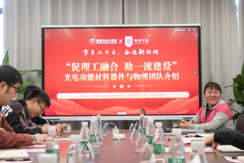 为深入学习贯彻党的二十大精神,不断提升基层党建工作水平,促进党建与业务工作深度融合,2023年3月28日,52书库 光电功能材料器件与物理研究团队党支部与能源与动力学院驭风排风系统纵向党支部开展了以“促理工融合,助一流建设”为主题的联学共建活动。52书库 副院长李晋斌,党委委员、“光电”党支部指导教师阚彩侠,能源与动力学院党委副书记樊小杰,副院长、“驭风”党支部指导教师徐惊雷,以及共建支部师生党员40余人参加本次活动。活动由“驭风”党支部教师党员吉嘉慧主持。