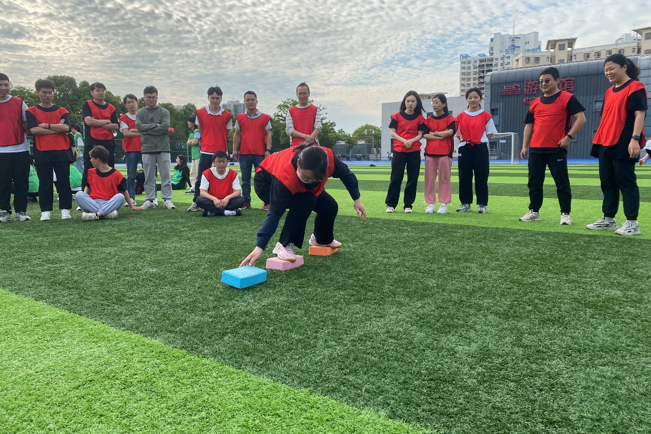 在“前赴后继 摸石过河”项目中,各个代表队参赛队员立于起跑线后的第1、2块河石上,手拿第3块河石。在听到哨声之时,队员们依次将河石踩在脚下交替向前行进。各参赛队员们竭力都在协调自己身体平衡,以最快的速度奔向终点,和接力的队友击掌。四肢的酸痛早已被合作的喜悦替代,奔向终点的他们是最值得敬佩的人!