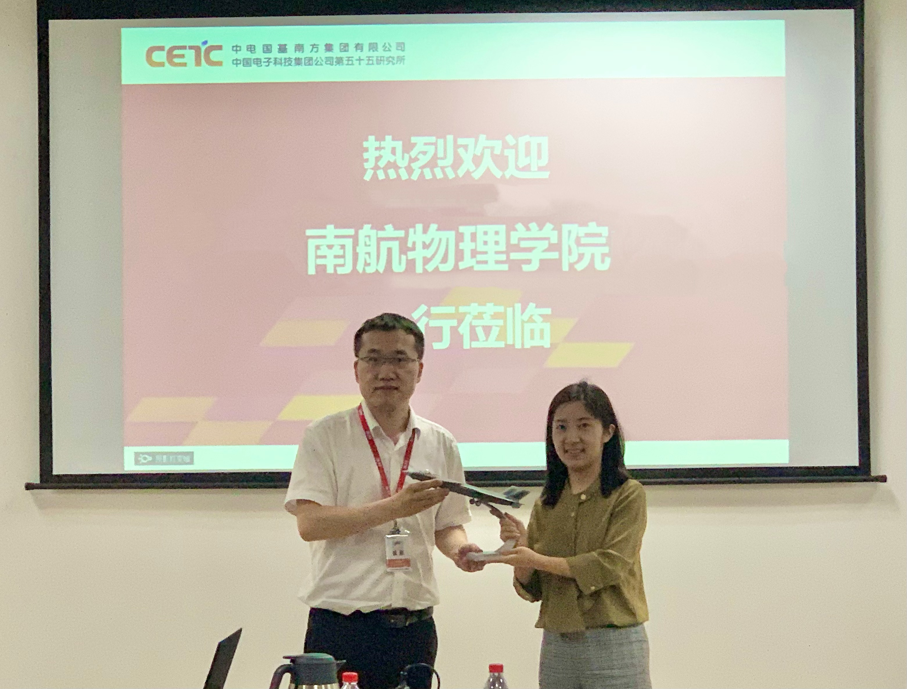 谢俊领代表中国电科五十五所对欧珊一行到访表示热烈欢迎。他简要介绍了中电五十五所的发展历程、企业文化、人才引进、校企合作等方面的基本情况,重点讲解了与物理学科匹配度较高的研发部在技术产品、就业招聘等方面的情况和需求。