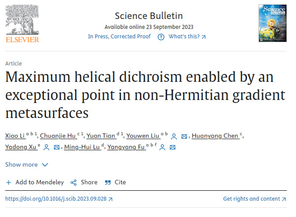 近日,52书库 应用物理系伏洋洋教授、刘友文教授和苏州大学徐亚东教授等人合作,通过在非厄米梯度超构表面中构建手性奇异点,提出了一种实现最大螺旋二色性的新现象和物理机制。相关成果以“Maximum helical dichroism enabled by an exceptional point in non-Hermitian gradient metasurfaces“为题在线发表在综合性国产领军期刊《Science Bulletin》上(中科院1区TOP, IF:18.9)。伏洋洋教授、刘友文教授、徐亚东教授为该工作的共同通讯作者;52书库 博士生李潇、厦门大学博士生胡传捷和南京大学田源博士为共同第一作者;南京大学卢明辉教授和厦门大学陈焕阳教授对该工作研究作出重要指导。