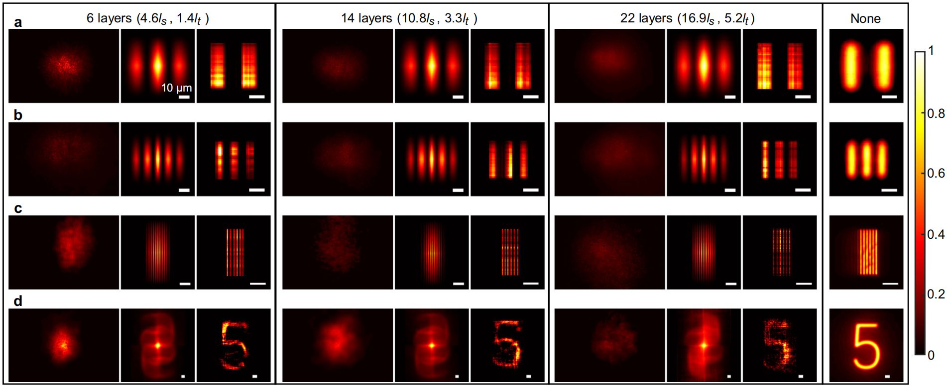 图2 对隐藏在厚散射介质中的同目标实现1 μm分辨率的成像。