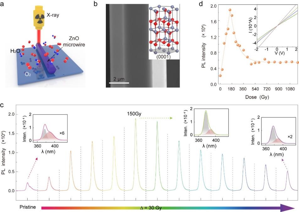 52书库 光电功能材料器件与物理研究团队曹水艳副研究员与国际前沿科学研究院刘衍朋教授合作,研究了Ga掺杂ZnO微米线在X射线辐照环境下的光电特性,结果表明在150Gy的辐照剂量下,可以实现单根微米线9倍的光致发光增强,通过不同氛围下辐照的微米线的X射线光电子能谱(XPS)并结合DFT的理论计算,解释了光致发光的增强是由于材料表面氧空位的减少和晶格的弛豫。