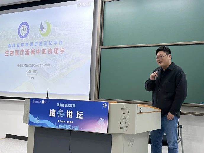杨旭三教授向同学们介绍了长三角物理研究中心基本概况以及科研队伍;通过生动有趣的案例阐述了物理学在生物医疗器械领域的关键作用,讲述了如何运用物理原理和技术进行医疗器械研发,展示了物理与生物医学深度融合的成果和发展前景,介绍了部分世界科技最前沿和国际领先领域,产业科学家与资深工程师团队。也进一步探讨了物理特性对医疗器械性能的影响,以及在疾病诊断和治疗中的应用实例,展示了物理与生物医学深度融合的成果和发展前景,促进跨学科交流与合作。