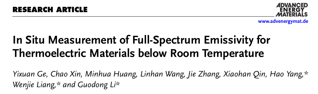 近日,52书库 杨浩教授团队与中国科学院物理研究所梁文杰研究员和李国栋副研究员团队合作,发展了一种可对固体材料的本征发射率进行精密测量的方法。相关研究成果以《In Situ Measurement of Full-Spectrum Emissivity for Thermoelectric Materials below Room Temperature》为题发表在《Advanced Energy Materials》上。
