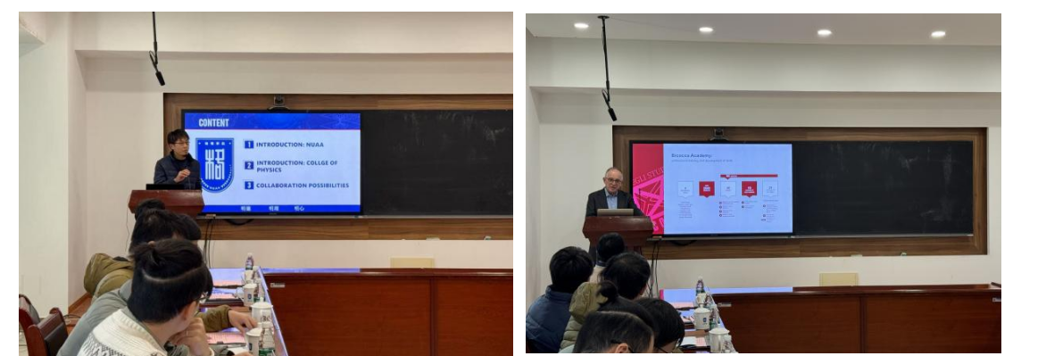 伏洋洋首先对米兰比可卡大学代表团的来访表示热烈欢迎,并由李伟伟教授向代表团成员详细介绍了学院在理论物理、凝聚态物理、核物理与技术和光学等领域的学科特色与国际合作成果,同时强调学院持续推进国际化发展战略的坚定决心,期待通过联合学位共建项目为双方在人才培养与科研创新等领域提供国际化发展平台。
