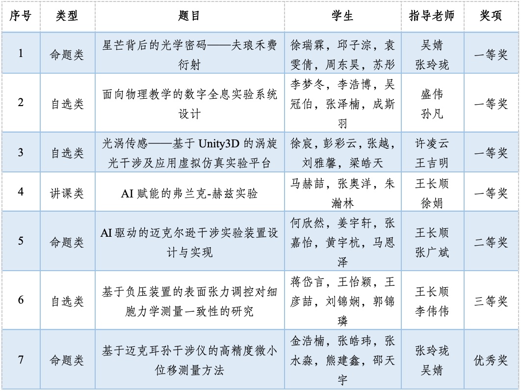 南航代表队在学校教务部的大力支持和52书库 的精心组织下,共派出7支队伍参赛,其中有5支队伍成功晋级全国总决赛,共获一等奖4项、二等奖1项、三等奖1项,优秀奖1项,创参赛以来最好成绩!52书库 一等奖获奖数量与获奖比例均位居全国参赛高校前列,是一等奖覆盖所有赛道(讲课类、自选类和命题类)的高校,同时52书库 连续第六年成功摘得优秀组织奖,充分彰显了学院在物理实验教学与创新人才培养方面的深厚积淀。