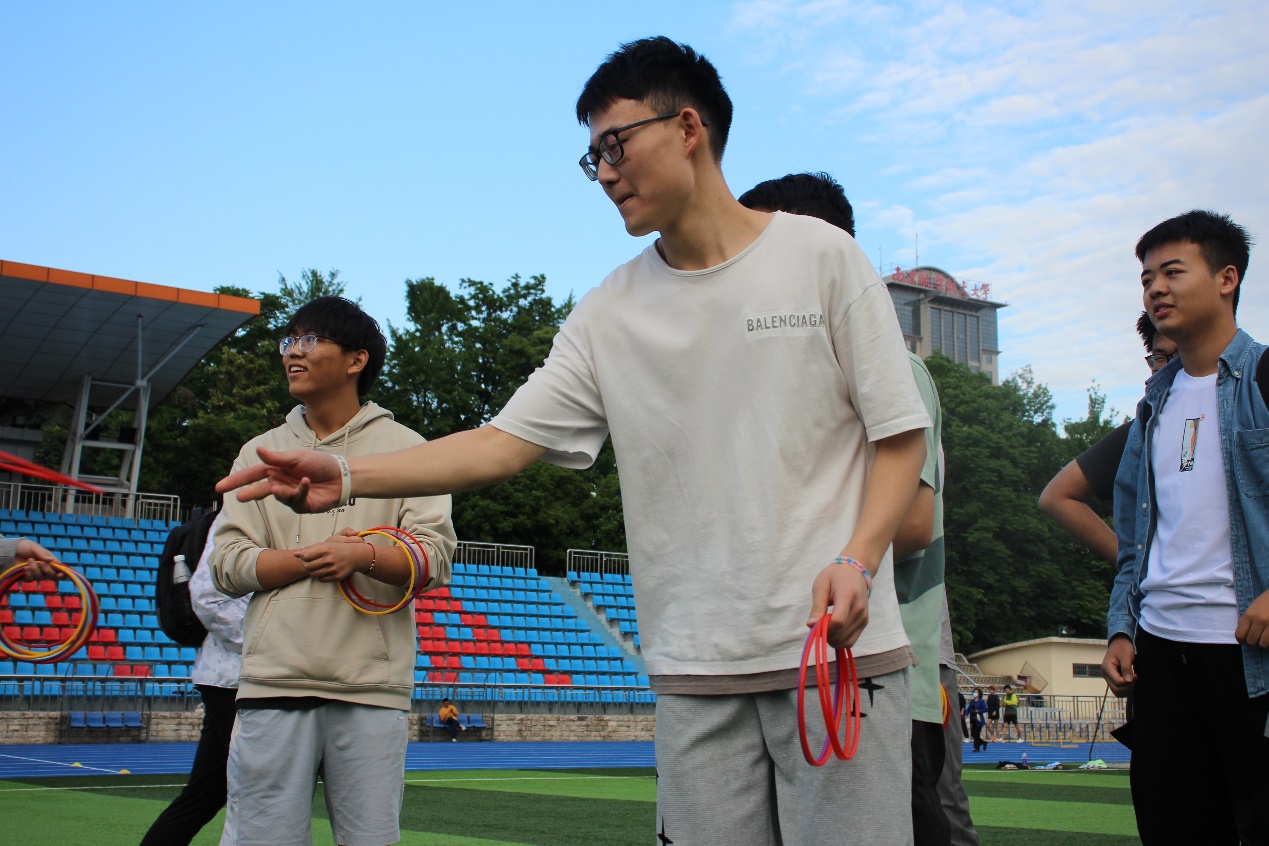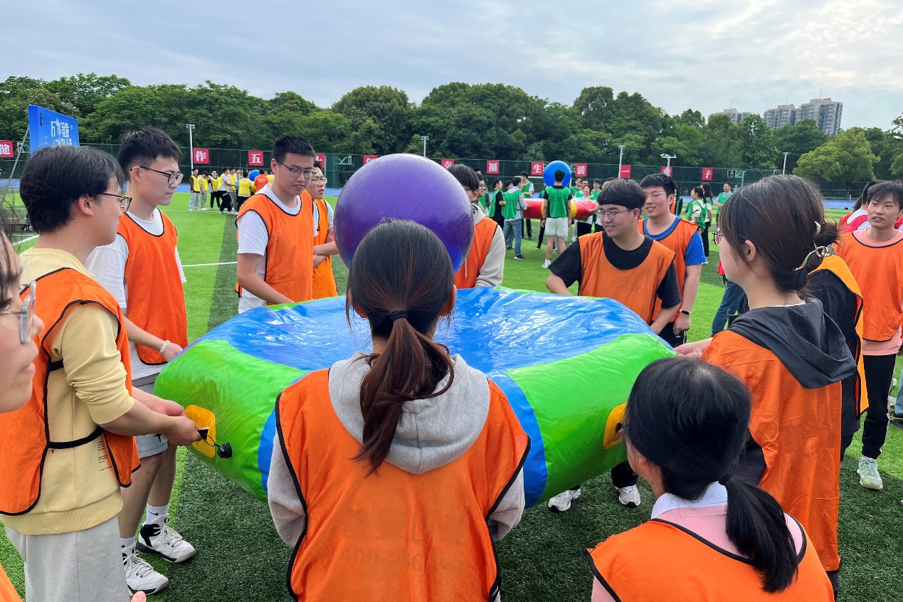 在“厚德载物 运转乾坤”项目中,四支代表队的选手们各自8名队员分工合作,努力配合,在听到哨声的一刹,合理扛着“乾坤球”在跑道上冲刺接力。在烈日照耀下,大家不畏艰辛,都在努力为团队争夺分数,越过终点线时的喜悦洋溢于脸上。