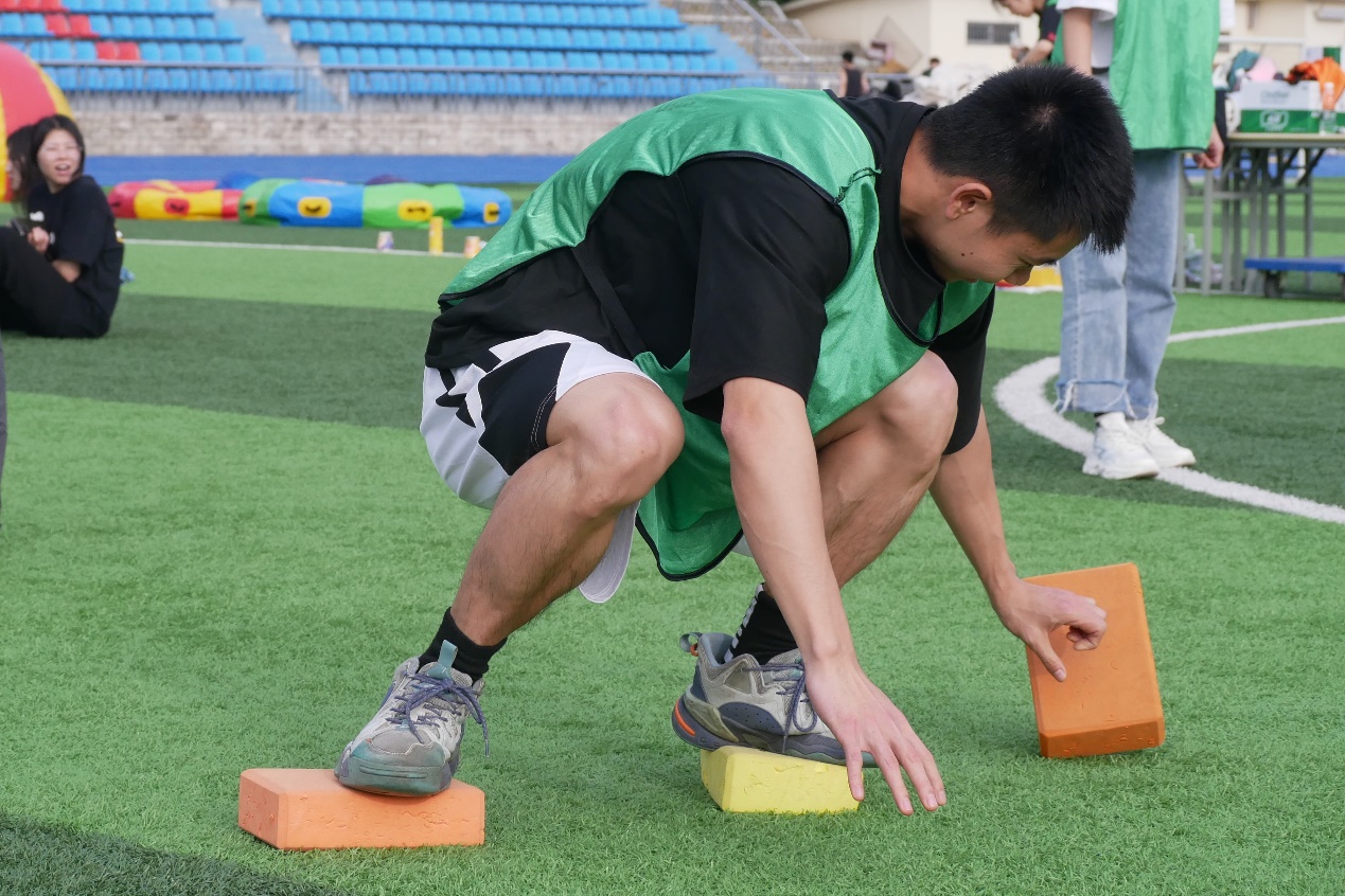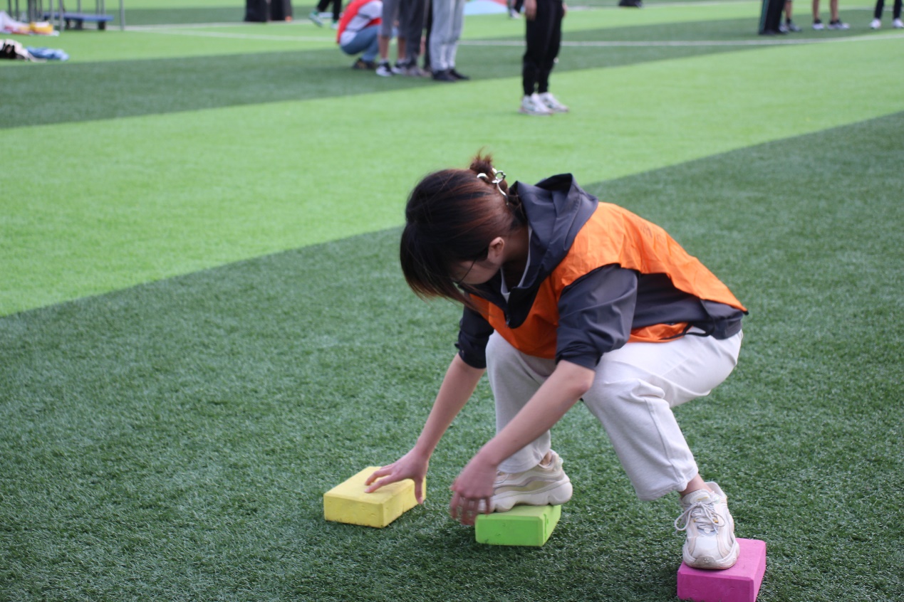 在“前赴后继 摸石过河”项目中,各个代表队参赛队员立于起跑线后的第1、2块河石上,手拿第3块河石。在听到哨声之时,队员们依次将河石踩在脚下交替向前行进。各参赛队员们竭力都在协调自己身体平衡,以最快的速度奔向终点,和接力的队友击掌。四肢的酸痛早已被合作的喜悦替代,奔向终点的他们是最值得敬佩的人!