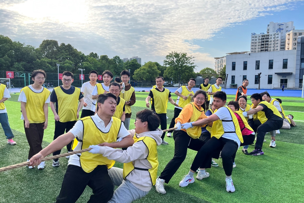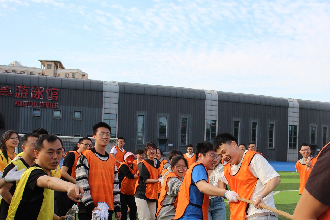在最激动人心的“团结一心 力拔山河”项目中,场上加油助威声此起彼伏。对于各个团队而言,拔河无疑是最激动人心的,粗长的绳子凝聚的不仅是场上队员的力量,更是场下各代表队老师与学生的信任。在一阵又一阵的加油声中,现场热烈气氛不断升温,师生们眼神坚定、方向相同、齐心协力共同迎战对手。参赛师生尽情挥洒气力,乐在其中。