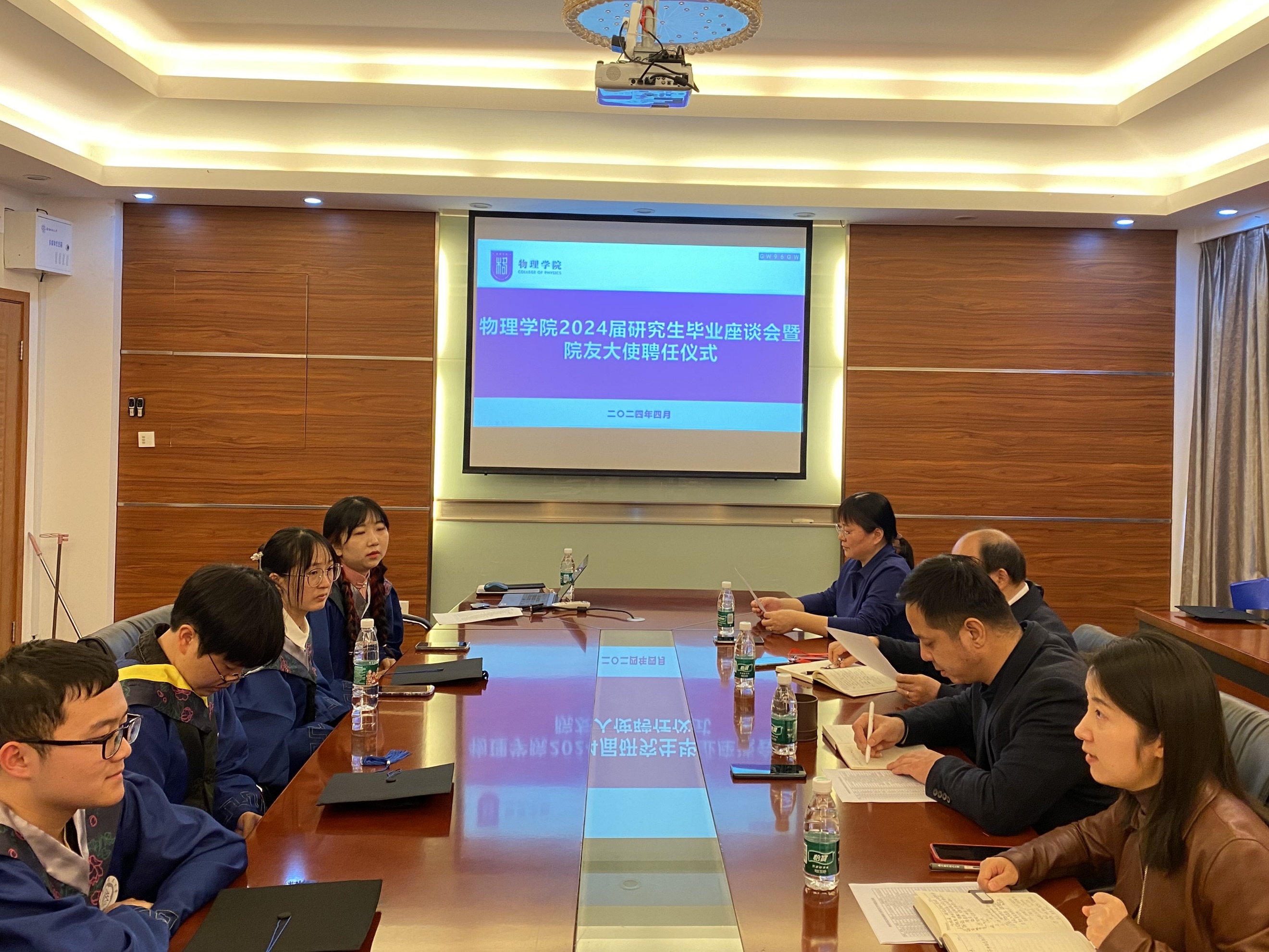 欧珊向到场的学院领导及研究生教育管理工作组成员介绍了2024届毕业生基本信息、就业升学去向等相关情况。全体毕业生畅所欲言,依次分享了各自在校期间的学习经历与成长体验,并围绕人才培养、教学科研、设施改善等方面提出了大量具有建设性的意见和建议,同时也表达了对学院的衷心感谢及美好祝愿。