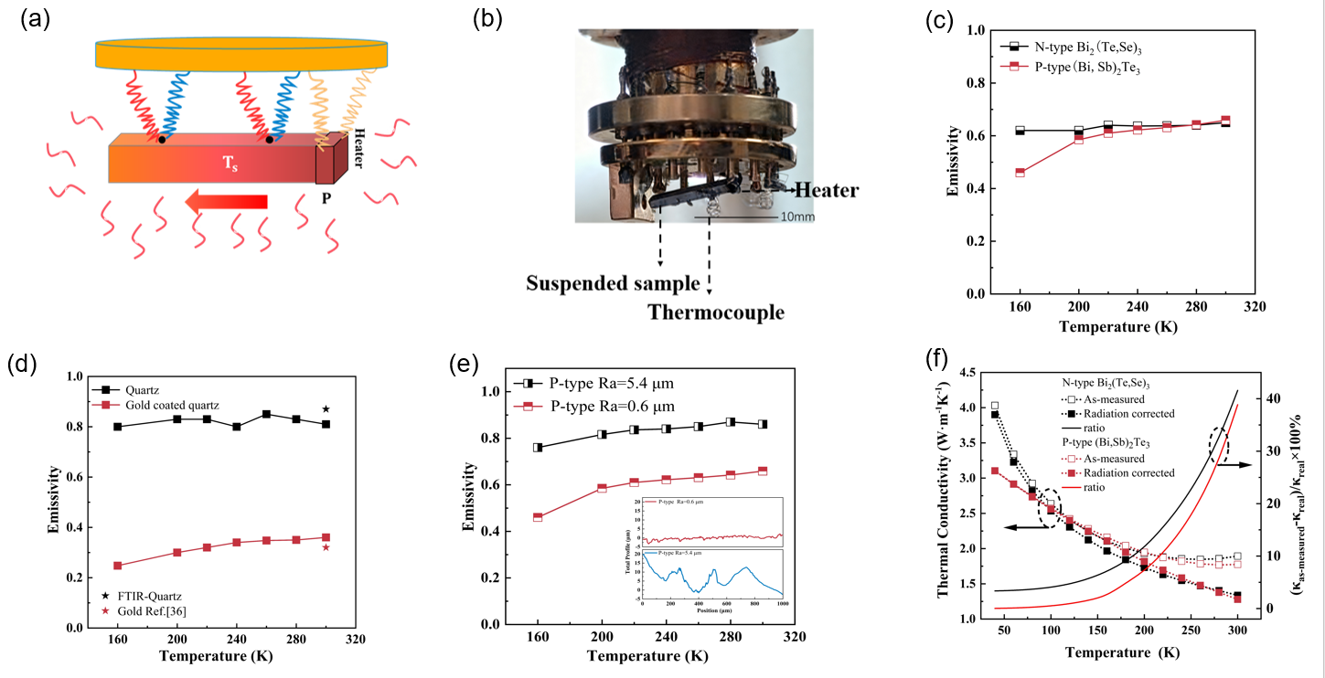 图a) 辐射系数原理示意图;b)实物图;c) N型和P型碲化铋基热电材料的辐射系数-温度图;d) 镀金前后石英的辐射系数-温度图;e) 不同粗糙度的P型辐射系数-温度图;f) N型和P型修正前后热导率结果(左轴);N型和P型热辐射修正占比(右轴)。